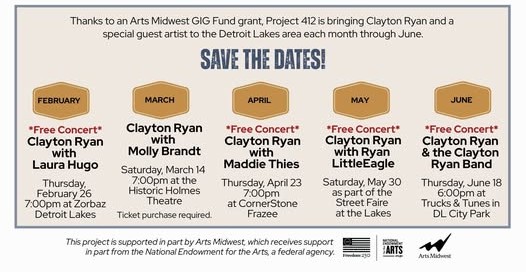 Project 412 is excited to welcome alt-country performer and emerging Midwestern songwriter Clayton Ryan as its newest Artist in Residence. The residency will bring Ryan and a rotating special guest artist to the Detroit Lakes area each month through June. Made possible by an Arts Midwest GIG Fund grant, the six-month residency will feature free concerts, songwriting workshops, and community outreach in the Detroit Lakes area and surrounding Minnesota communities. The local outreach efforts will be led by the Historic Holmes Theatre.
